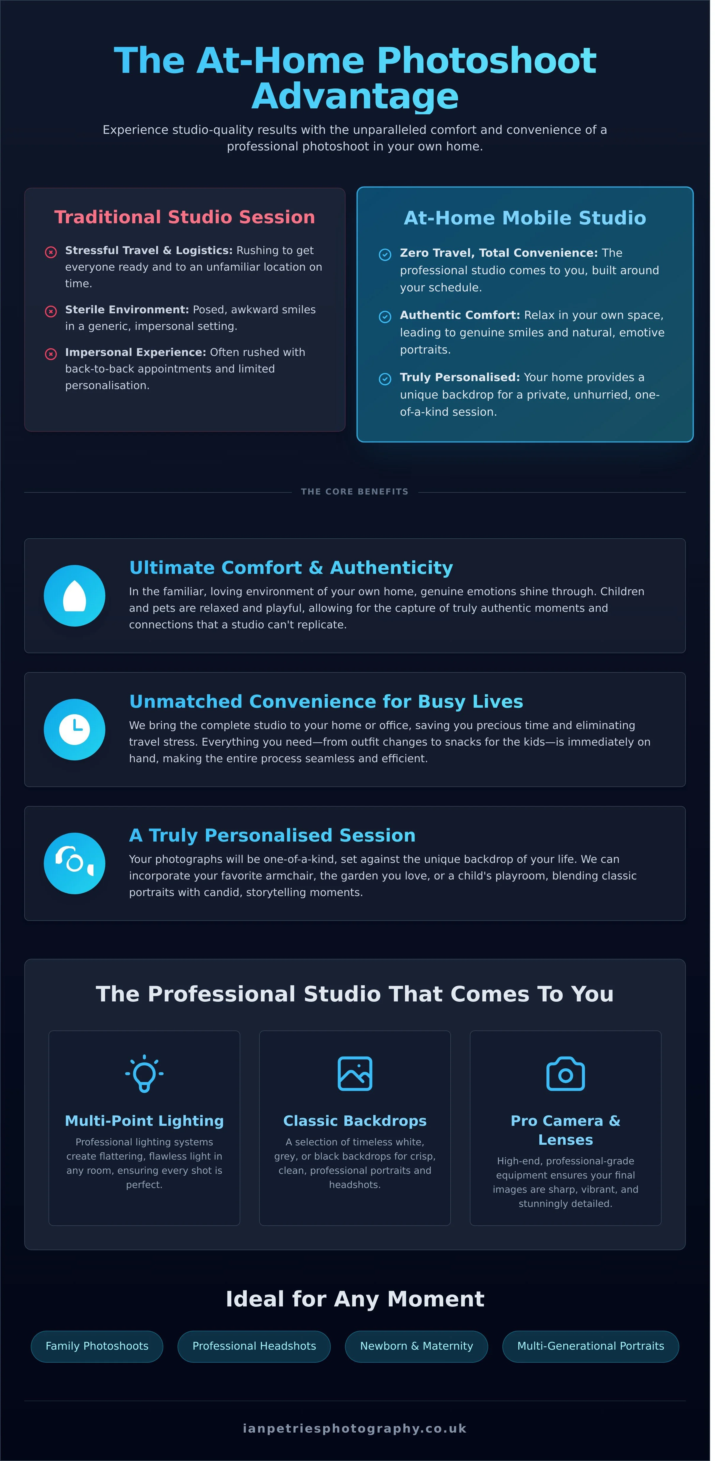 In today's fast-paced world, the idea of a traditional studio session can feel daunting. That's why more families and professionals are discovering the profound advantages of bringing the studio experience home. By choosing from our bespoke family photoshoots and head shots with a photographer that can offer mobile studio setups at your own home, you are opting for a session defined by comfort, convenience, and truly personal results that a fixed location simply cannot replicate.