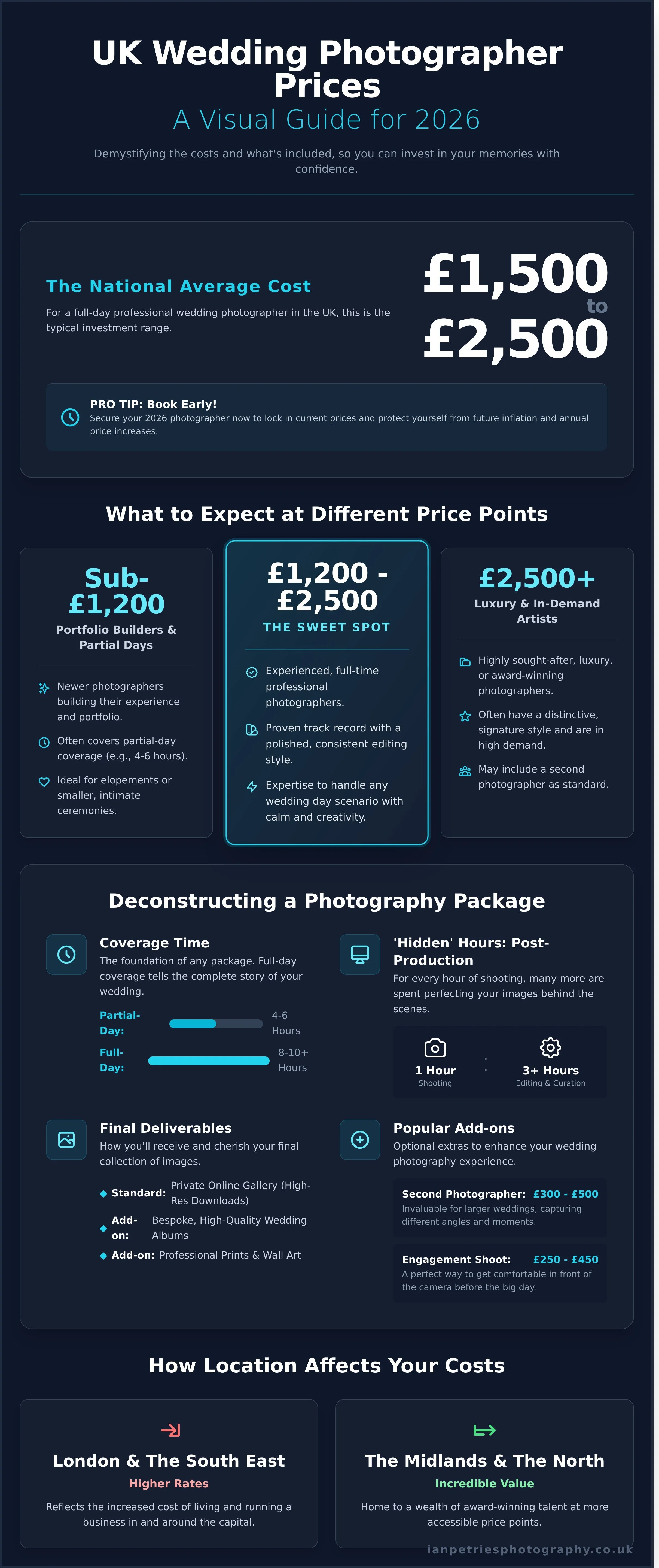 Let's get straight to the heart of the matter. For a full-day professional wedding photographer in the UK, you can expect to invest between £1,500 and £2,500. This figure represents the national average for experienced photographers who will capture your day from morning preparations to the evening's first dance. Understanding the typical uk wedding photographer prices 2026 is the first step in finding the perfect artist for your special day.